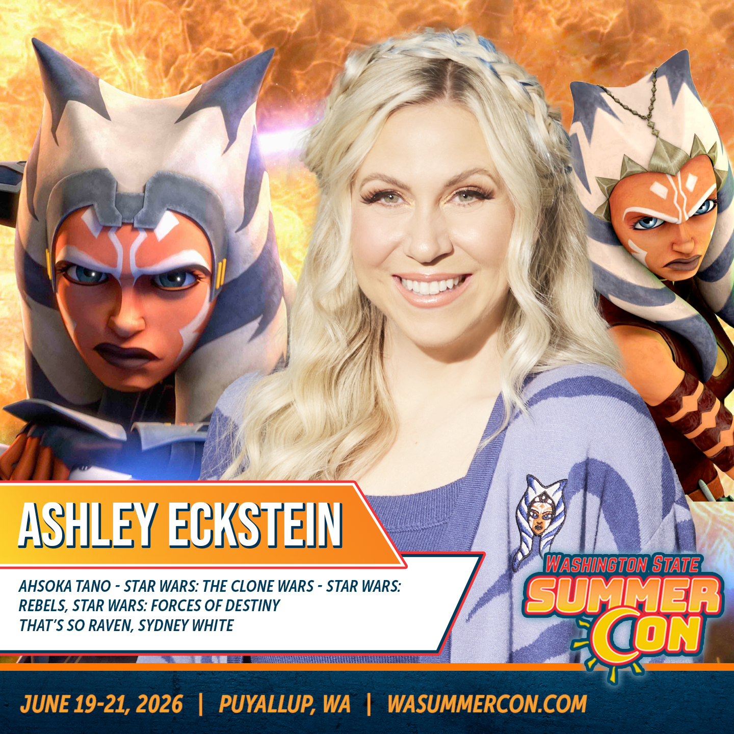 Ashley is an accomplished on-screen and voice actress. She provided the voice of Ahsoka Tano on Star Wars: The Clone Wars, Star Wars Rebels, Star Wars: Tales of the Jedi, and Star Wars Forces of Destiny. Eckstein reprised her role as Ahsoka with a short voice cameo in Star Wars: The Rise of Skywalker.